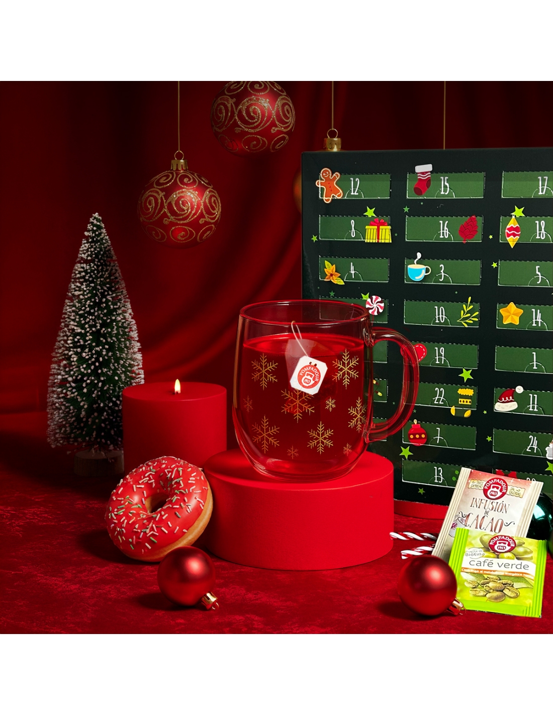 El Calendario de Adviento Pompadour es una invitación a saborear el espíritu navideño cada día con una infusión diferente. En su interior te esperan 48 bolsitas que combinan los mejores tés e infusiones Pompadour, cuidadosamente seleccionadas para llenar diciembre de aromas, colores y pequeñas sorpresas.